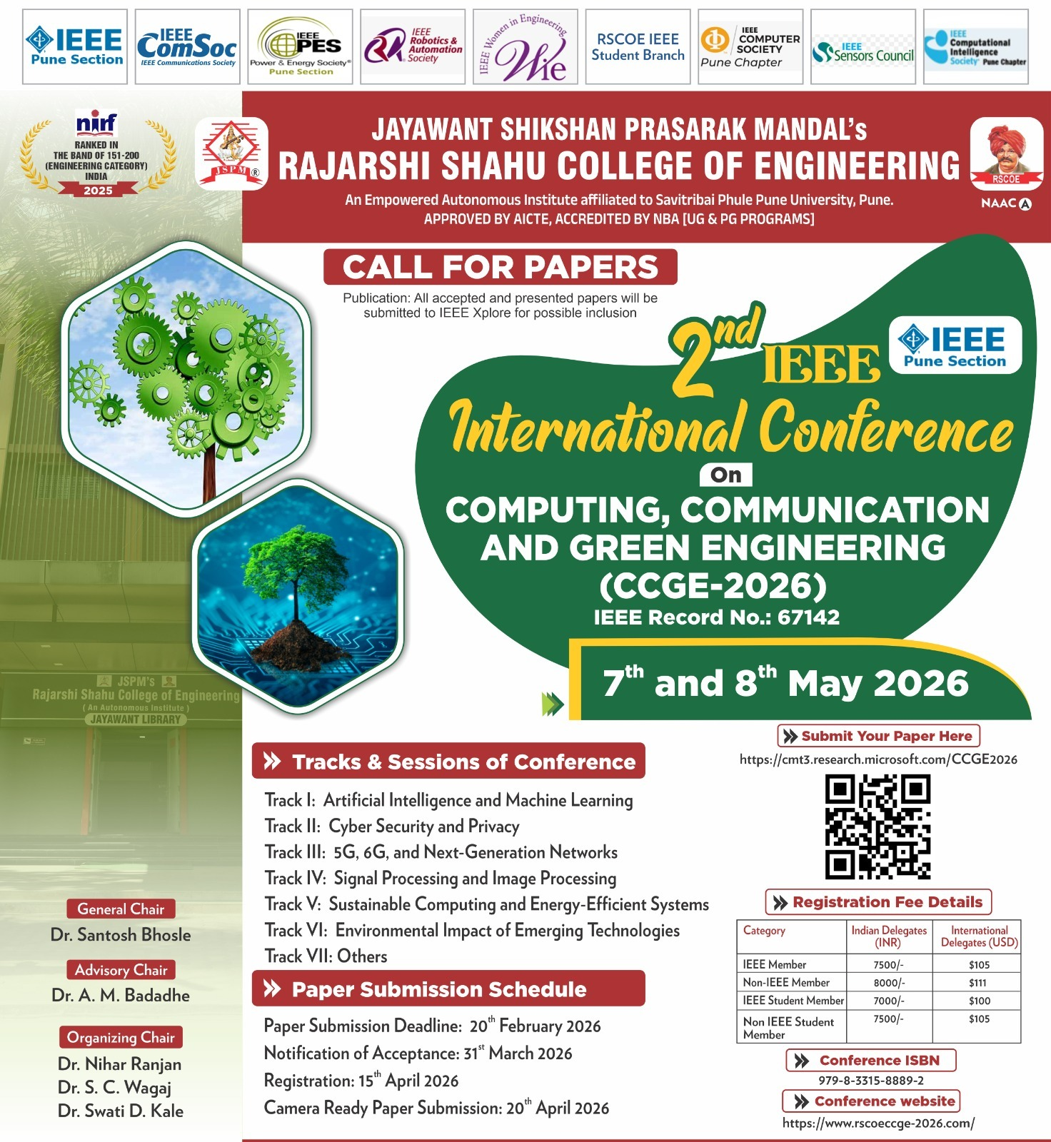 The 2nd International Conference on Computing, Communication and Green Engineering (CCGE-2026) aims to bring together leading academic scientists, researchers and scholars to exchange and share their experiences and research results on all aspects of Computing, Communication and Green Engineering. It also provides a premier interdisciplinary platform for researchers, practitioners and educators to present and discuss the most recent innovations, trends, and concerns as well as practical challenges encountered and solutions adopted in the fields of Computing, Communication and Green Engineering.